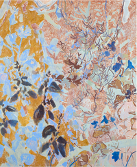 My process starts with laying down shapes that are suggestive of silhouettes, often in unexpected scale, on a surface of diluted color. This ghost-like backdrop is the initial structure from which the painting develops. Similar to viewing a garden - looking upon one area and moving your eye across - certain details capture your focus and your eyes ‘dance’ around the space. In a similar way I create my artworks; with no plan, they are free to ‘grow’ across the surface. I respond to the silhouette background, and working with a limited palette of acrylics, I paint - or rather draw with a paintbrush- directly into layers of dry pastel. This method creates an immediacy and forces line work to be irreplicable. The mediums interact to force a uniqueness of mark making. Charcoal and graphite are quickly and expressively applied, before, with a similar gusto, the mediums are removed or worked back into, to alter their appearance.